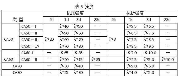 各類型鋁酸鹽水泥各齡期強(qiáng)度指標(biāo)應(yīng)符合表3 的規(guī)定