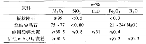 以白剛玉顆粒(5~3、3~1、0~1mm)為骨料,剛玉粉(≤0.074mm)為骨料,鋁鎂尖晶石粉(≤0.074mm)、活性α氧化鋁微粉為細(xì)粉,純鋁酸鈣水泥為結(jié)合劑,聚丙烯纖維、偶氮甲酰胺、碳酸氫鈉及復(fù)合防爆劑聚丙烯纖維+碳酸氫鈉等為防爆劑。原料的組成見(jiàn)下表1。