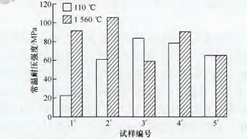 圖3 不同溫度處理后各試樣的常溫耐壓強(qiáng)度