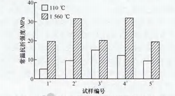 圖2 不同溫度處理后各試樣的常溫抗折強(qiáng)度